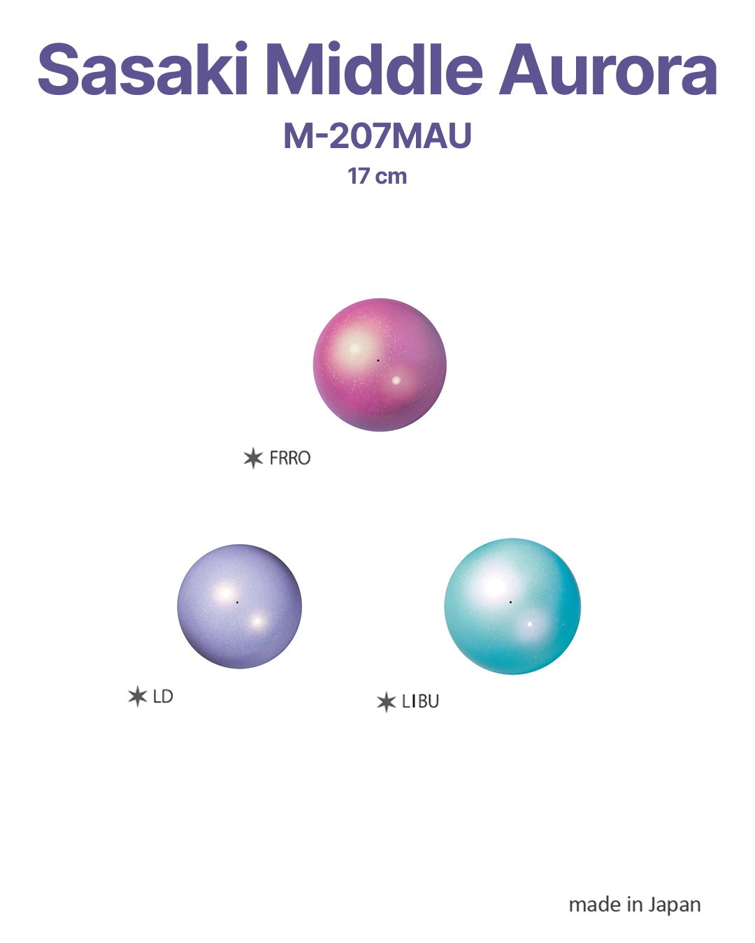 The Sasaki Middle Aurora M-207MAU LD 17cm is one of the most visually striking glitter balls in rhythmic gymnastics. Its pearlescent, metallic finish reflects light beautifully, making the ball highly visible under stage lighting and spotlights on the competition floor. It is a perfect choice for competitions, performances, and training where visual impact matters as much as technique.