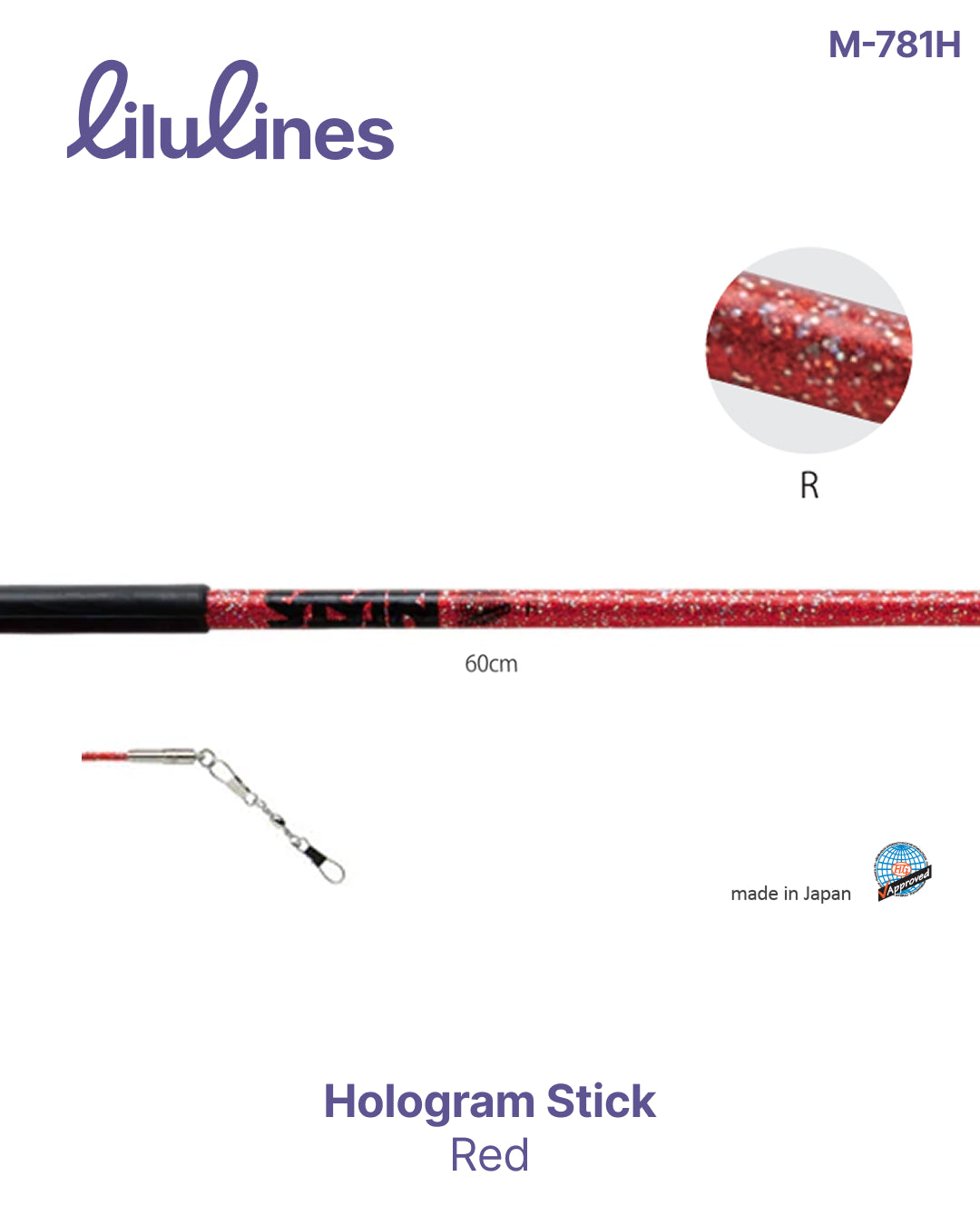 The Sasaki Hologram Stick M-781H is a professional 60 cm rhythmic gymnastics ribbon stick approved by FIG. Its lightweight fiberglass structure and holographic coating create a stunning shine under lights during training and performances.