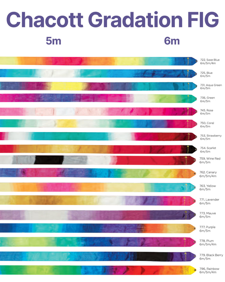 Профессиональная лента Chacott серии Gradation, сертифицированная FIG. Обладает плавным художественным переходом цвета, лёгкостью и стабильной работой в воздухе. Изготовлена из высококачественной вискозы, что обеспечивает чистый полёт и выразительность каждого движения. Подходит как для тренировок, так и для официальных соревнований.